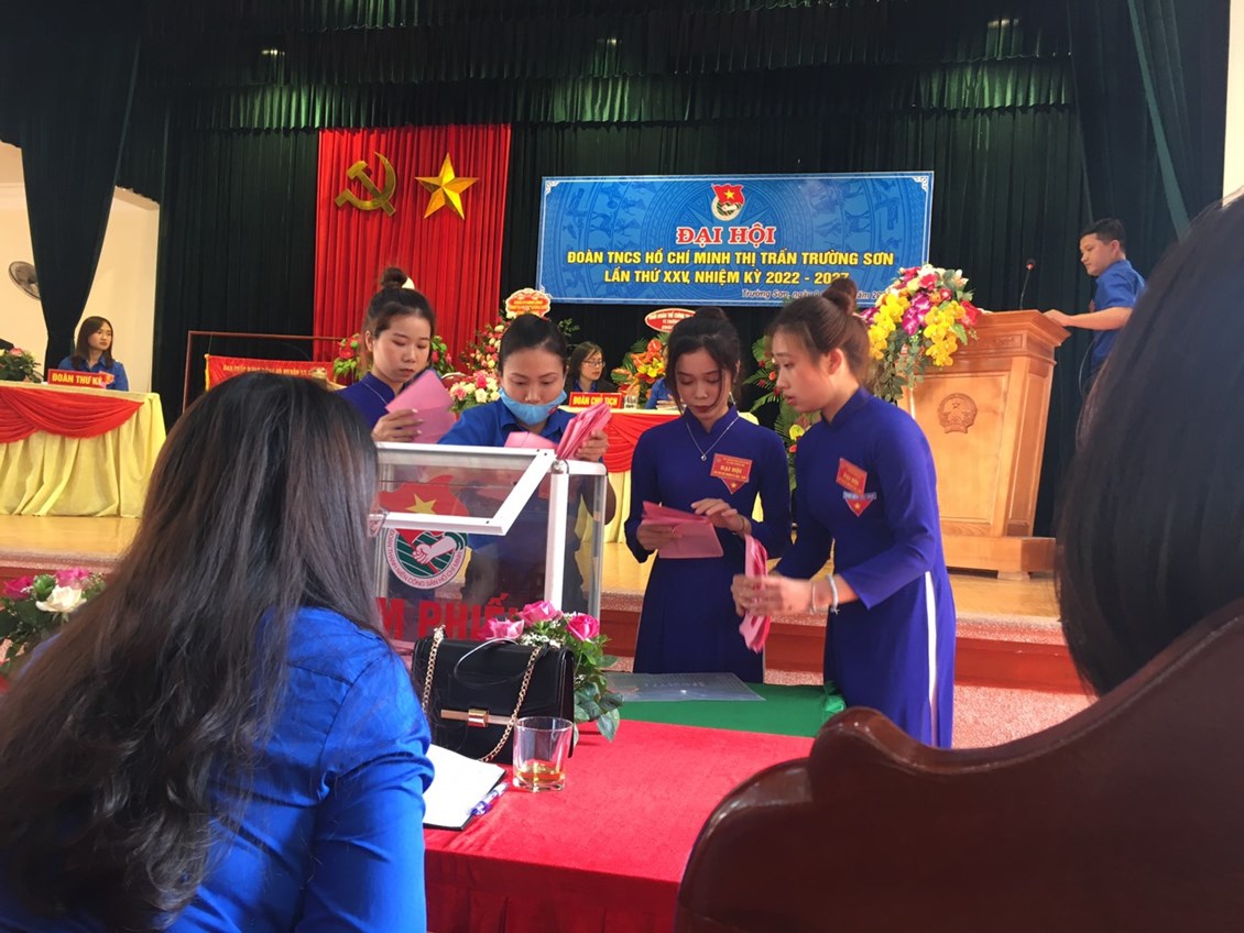 Hình ảnh cácđoàn thanh niên tham gia bỏ phiếu bầu Ban chấp hành Đoàn thanh niên thị trấn Trường Sơn .