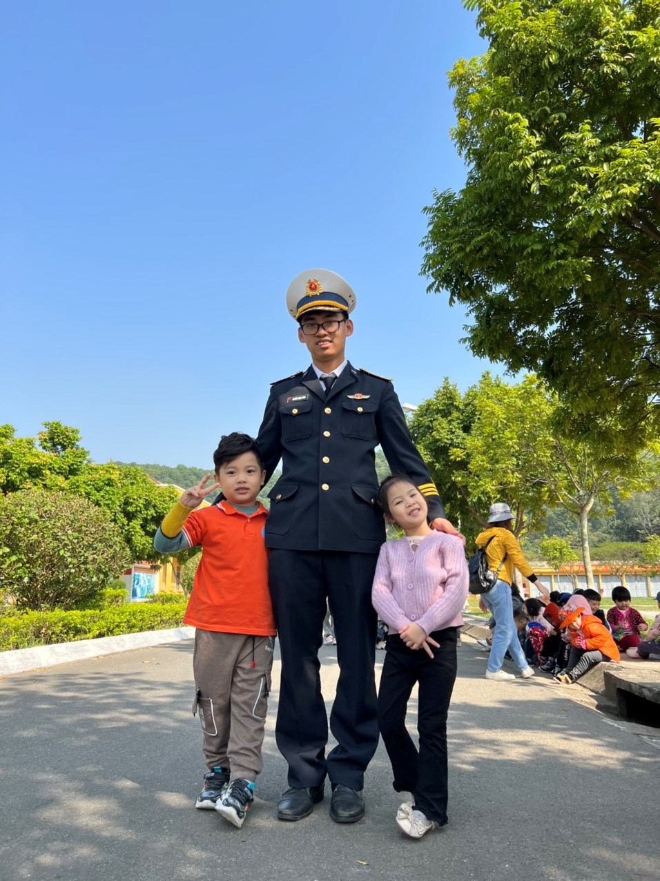Chú bộ đội dẫn các con đi tham quan doanh trại