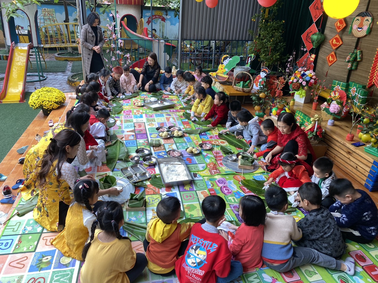 Các bé nhà trẻ cùng các cô gói bánh chưng